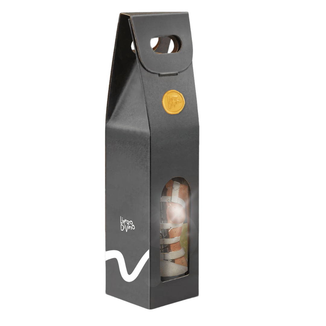 Con relieve al tacto, detalles dorados y textura de lienzo que viste tu vino