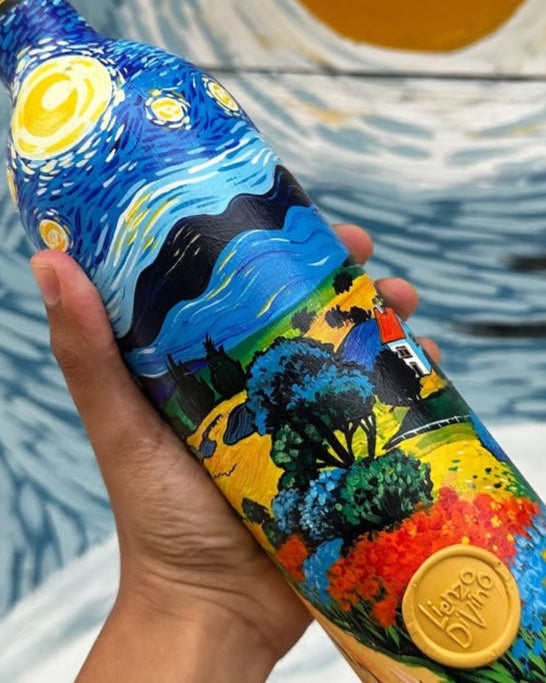Las botellas etiquetadas llevan diseños impresos de alta calidad con detalles en relieve, mientras que las pintadas a mano son piezas únicas, intervenidas directamente sobre el vidrio por artistas mexicanos.