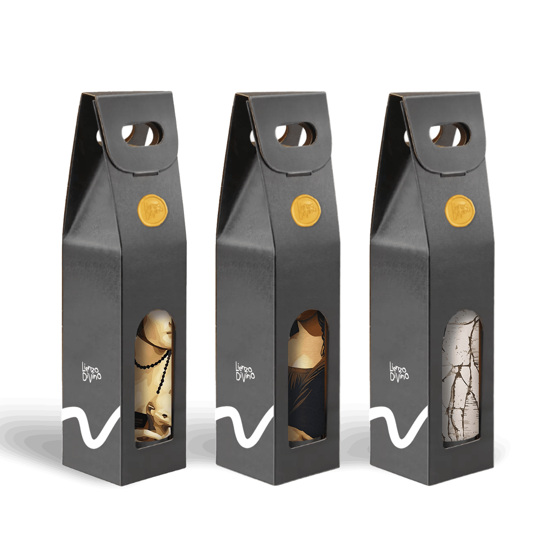 Con relieve al tacto, detalles dorados y textura de lienzo que viste tu vino
