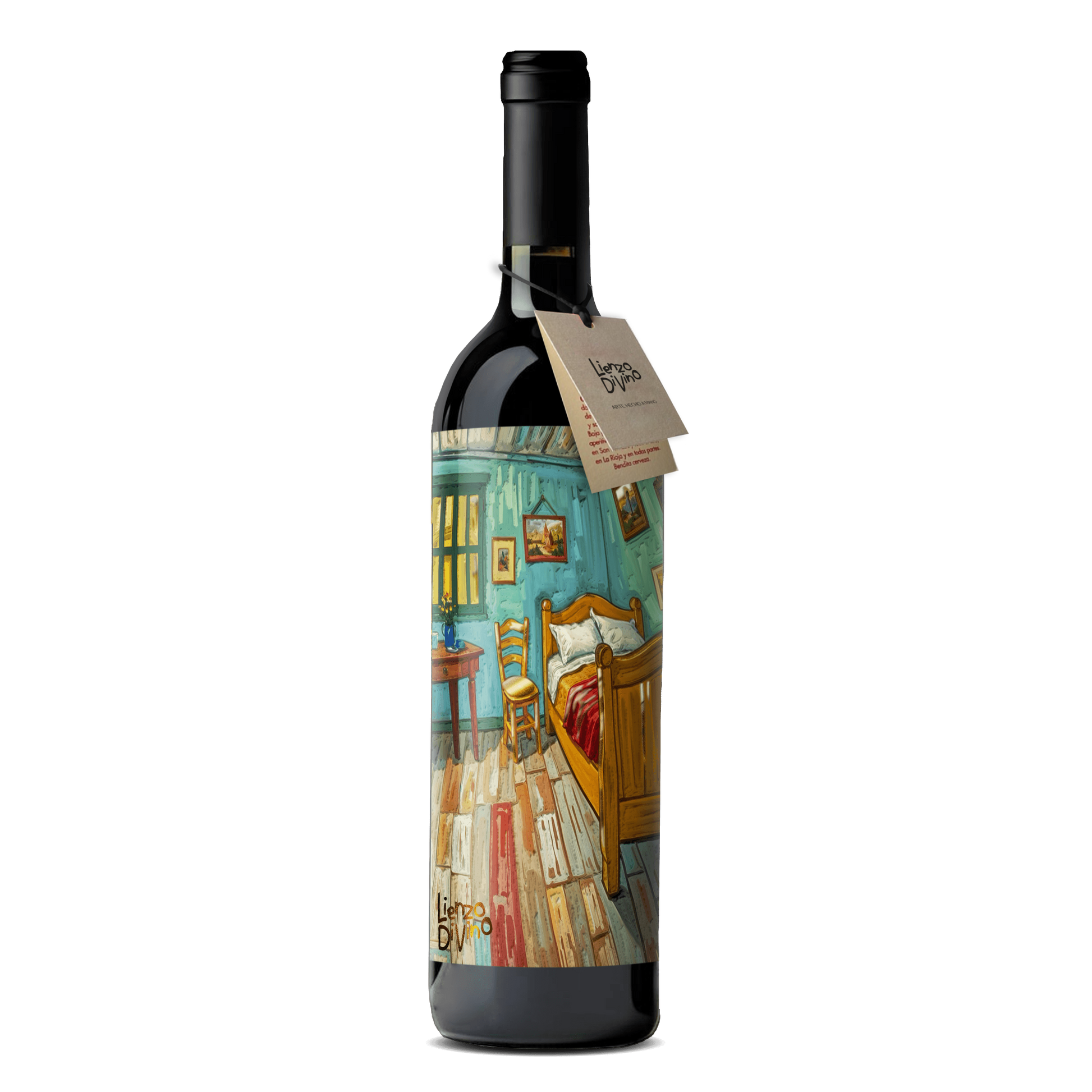 Con relieve al tacto, detalles dorados y textura de lienzo que viste tu vino