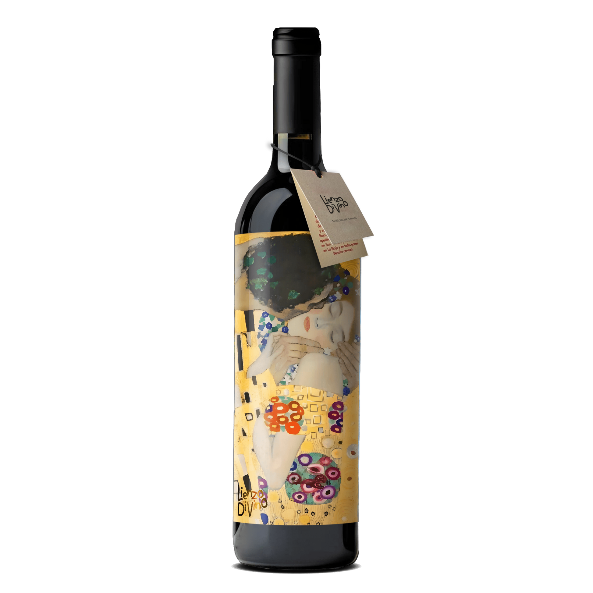 Con relieve al tacto, detalles dorados y textura de lienzo que viste tu vino